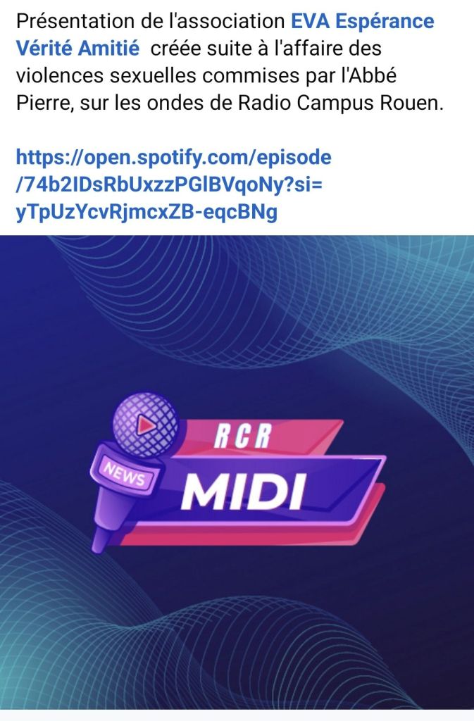 S’agissant de l’Affaire Abbé Pierre – Emmaüs, EVA anime et coordonne un groupe d’étude sur les violences sexuelles commises par l’Abbé Pierre. Une grande partie des informations qui sont parues dans les médias depuis l’été 2024 est due au travail d’EVA, effectué en collaboration avec des journalistes d’investigation. Plus de la moitié des documents d’archives et des contacts utiles au journalisme d’investigation utilisés dans les médias français ont été communiqués par EVA qui fonctionne indépendamment des instances de direction actuelle du Mouvement Emmaüs. EVA s’engage à accomplir un devoir de vérité pour les victimes et produit des savoirs utiles à l’ensemble de la société. EVA considère que l’affaire Abbé Pierre – Emmaüs constitue un tournant historique majeur dans la lutte contre les violences et le harcèlement sexistes et sexuels.