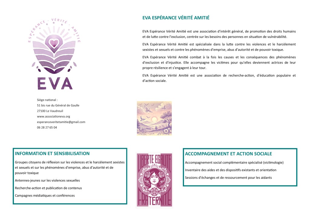 EVA Espérance Vérité Amitié est spécialisée dans la lutte contre les violences et le harcèlement sexistes et sexuels et contre les phénomènes d’emprise, d’abus d’autorité et de pouvoirs toxiques.