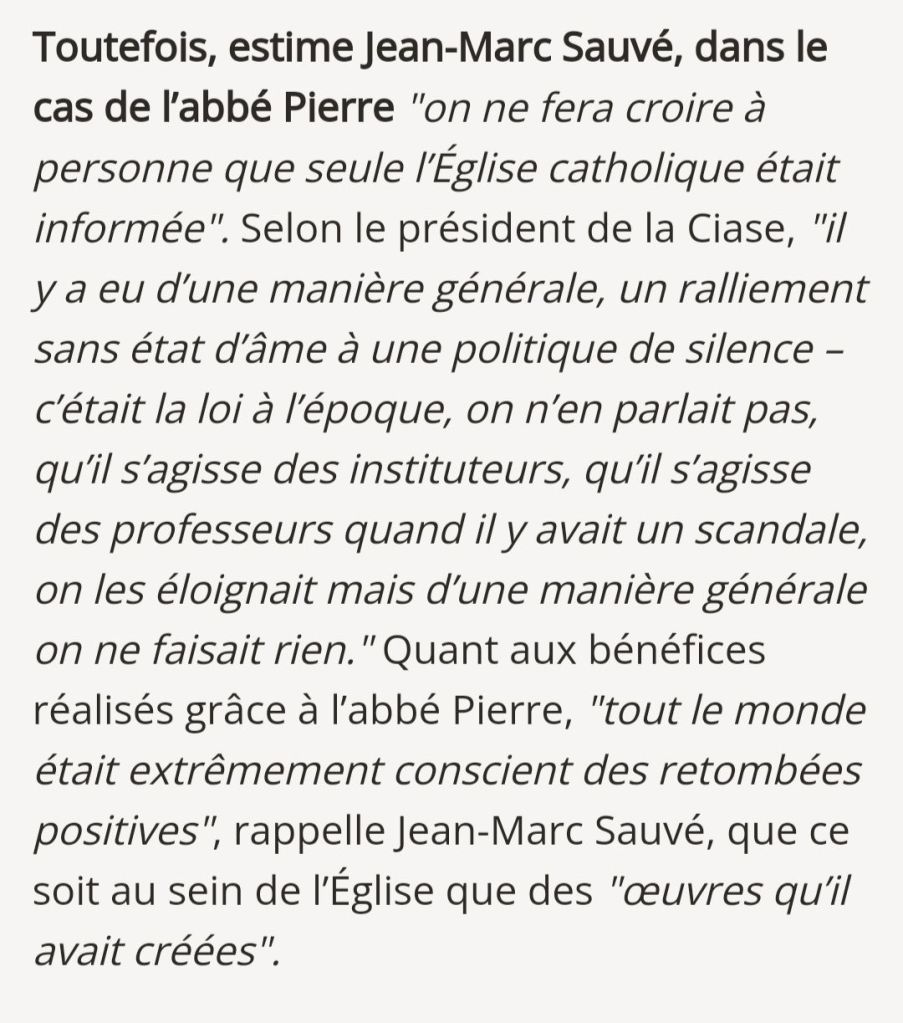 L’abbé Pierre accusé de violences sexuelles : au moins « quelques évêques » savaient dès les années 1950, affirme le président de la Conférence des évêques de France, 16 septembre 2024 : https://www.francetvinfo.fr/faits-divers/abbe-pierre-accuse-de-violences-sexuelles/l-abbe-pierre-accuse-de-violences-sexuelles-au-moins-quelques-eveques-savaient-des-les-annees-50-affirme-le-president-de-la-conference-des-eveques-de-france_6784438.html