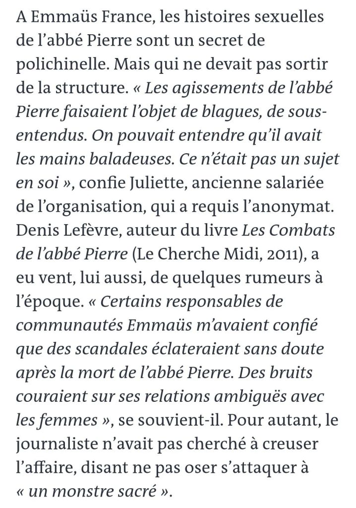 « Abbé Pierre : le Vatican et l’épiscopat français savaient », 26 septembre 2024. https://www.temoignagechretien.fr/abbe-pierre-le-vatican-et-lepiscopat-francais-savaient/